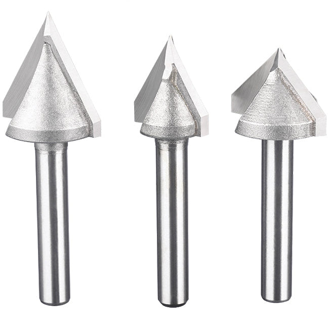 V bits (or V-groove bits) have a pointed tip and angled sides, forming a “V” shape. They’re designed to carve sharp, clean lines and tapered grooves. 90 Degree angle and 22 mm Diameter. 6mm Shank